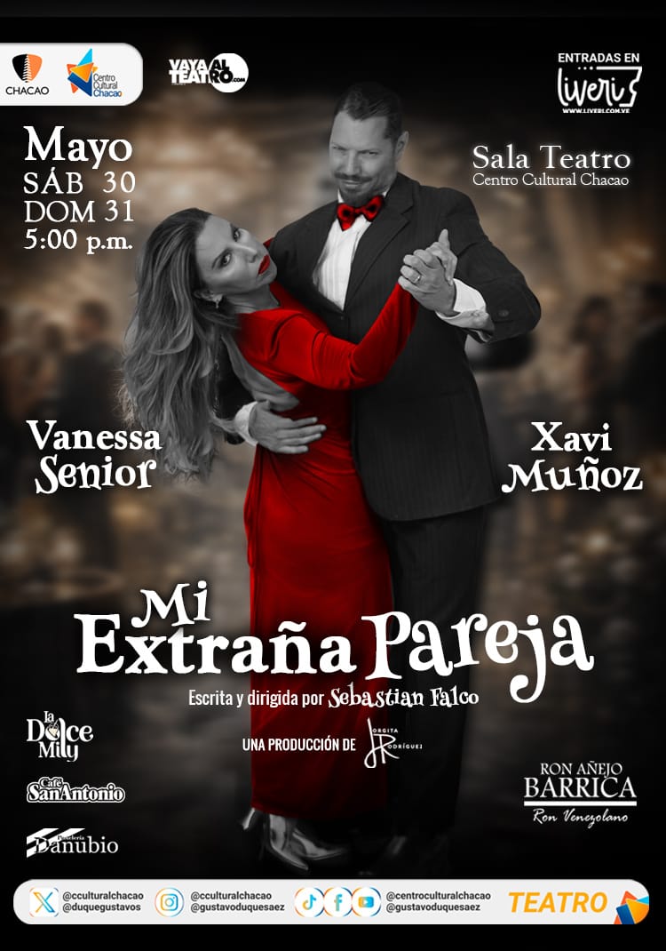 La propuesta teatral de Vayaalteatro.com escrita y dirigida por Sebastian Falco con la producción general de Jorgita Rodríguez y con las actuaciones de Vanessa Senior y Xavy Muñoz, se presentará los días 30 y 31 de mayo de 2026 a las 5:00 p.m. en el Teatro Chacao de Caracas.